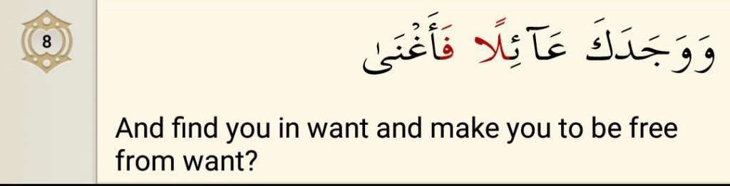 The word ayla in this verse means poor or financially desperate. Aa’il is someone who is under so much pressure that they feel like they are being crushed by it. The word ayaal is used to describe someone financially responsible for their family and which almost feels like a burden placed on you. Allah says that He found Muhammad pbuh crushed by the weight of this problem, in a desperate state and then He made him free of need.