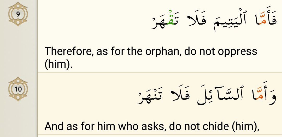 Now Allah commands acts which goes as gratitude in correspondence of Allah’s favours. Allah says As you yourself have been an orphan, and Allah graced you with the bounty that he made the best possible arrangements to help you in that state, therefore, in gratitude you should see that no orphan is treated unjustly and harshly.
