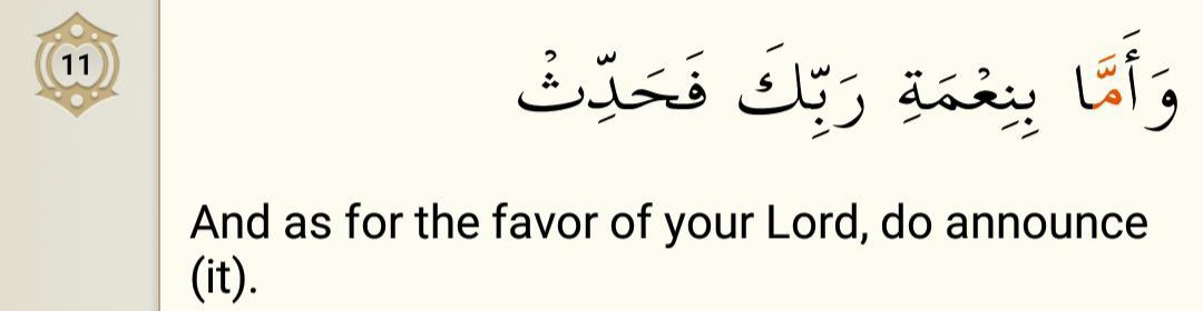 Finally Allah says “O Prophet, mention and proclaim every bounty that Allah has favored you with.” And the way of proclaiming the bounties is that Allah be thanked with the tongue and the truth be acknowledged that all the bounties received are only due to His grace and favor and none is the result of any personal excellence and merit on his part.