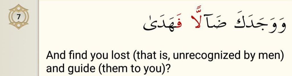 This verse means that the Prophet pbuh was lost in a society, engrossed in ignorance, and his personality as a guide and leader was not in anyway prominent before Prophethood. It means that in the desert of ignorance, he was standing like a lonely tree, which had the capability to bear fruit and turn the whole desert into a garden, but this capability was not being put to any use before Prophethood. It means that the extraordinary powers that Allah had blessed him with, were going waste in the unfavorable environment of ignorance. Yet, even the lost state of the Messenger pbuh is better than many of us today as he had the best of Fitrahs (natural disposition).