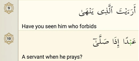 This second part of Surah was revealed when Prophet pbuh began to perform the Prayer in the Kaba and Abu Jahl threatened and tried to prevent him from this. The Quraish felt for the first time that he had adopted a new religion. The other people were watching it with curiosity, but Abu Jahl in his arrogance threatened the Prophet pbuh and forbade him to worship in the Kaba.