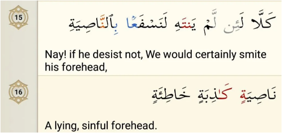 Allah uses two adjectives to describe Abu Jahl’s forehead, lying and sinful. Allah firstly calls it a lying forehead. This is an insult and a humiliation for one of the leaders of the Quraish and it is important to appreciate the political ramifications of this. Allah exposed Abu Jahl as having already accepted that this was the truth internally and that he refused to humble himself, making him sinful.