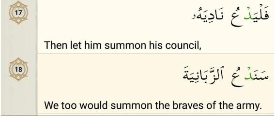 Allah now comes back to this life and issues Abu Jahl a challenge. When the Prophet pbuh rebuked Abu Jahl on his foolish behavior, he had retorted: “O Muhammad, on what strength do you threaten me? By God, my supporters in this valley far exceed yours in number.” At this it is being said: “Let him call his band of supporters.” Abu Jahl used to sit in such a public place with his entourage. Allah is telling the Messenger pbuh to tell Abu Jahl to call the people he calls upon.