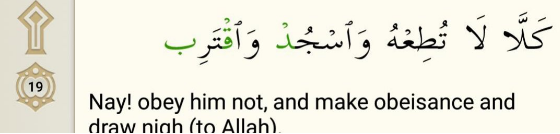 The Prophet pbuh was engaged in the work of giving dawah, despite this he faced constant animosity towards his noble efforts. It is demoralising being physically and verbally abused like this. Thus, at the end of this surah Allah disregards Abu Jahl and turns to talk to his Messenger pbuh. Almost like Allah is saying don’t worry about him (Abu Jahl), this man is not a big deal, don’t stress. Allah tells the Prophet pbuh not to pay any attention to Abu Jahl. Rather, he should focus at his mission and prostrate and come close to Allah.
