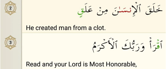 Then again the term Iqra is emphasized, when the Prophet pbuh said he can not read, the upcoming verses again stressed to read meaning: ‘you can read (proclaim) because of the extreme graciousness and the extraordinary generosity of your Lord’. Allah says Iqra a second time with the purpose of encouraging the Prophet pbuh to read – almost like a pat on the back.