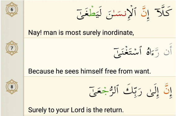 Following the last verses in which some material and spiritual gifts of Allah bestowed on Man were mentioned, that which demands his gratitude and absolute submission to Him, here Allah says that indeed man behaves rebelliously for he thinks himself to be self-sufficient, and although towards your Lord indeed is the return.