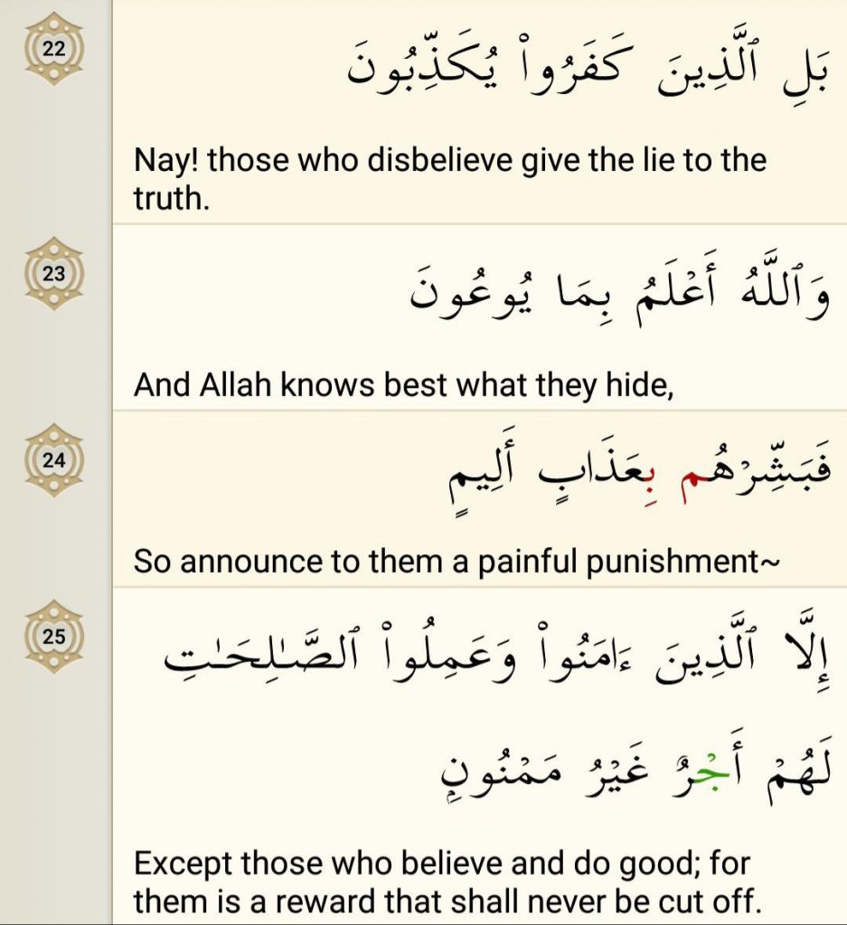 In conclusion, the disbelievers who repudiate the Quran instead of bowing down to God when they hear it, have been forewarned of a grievous punishment and the good news of limitless rewards has been given to the believers and the righteous.