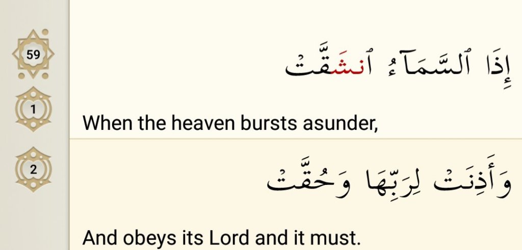 At the beginning of this Surah it talks about the awful and horrifying events which will happen at the end of this world. Allah says the Day when the heaven will burst assunder. Inshaqaaq means to be torn completely and in Arabic it is used when you tear something which you do not normally associate with tearing.