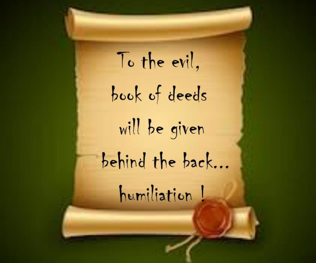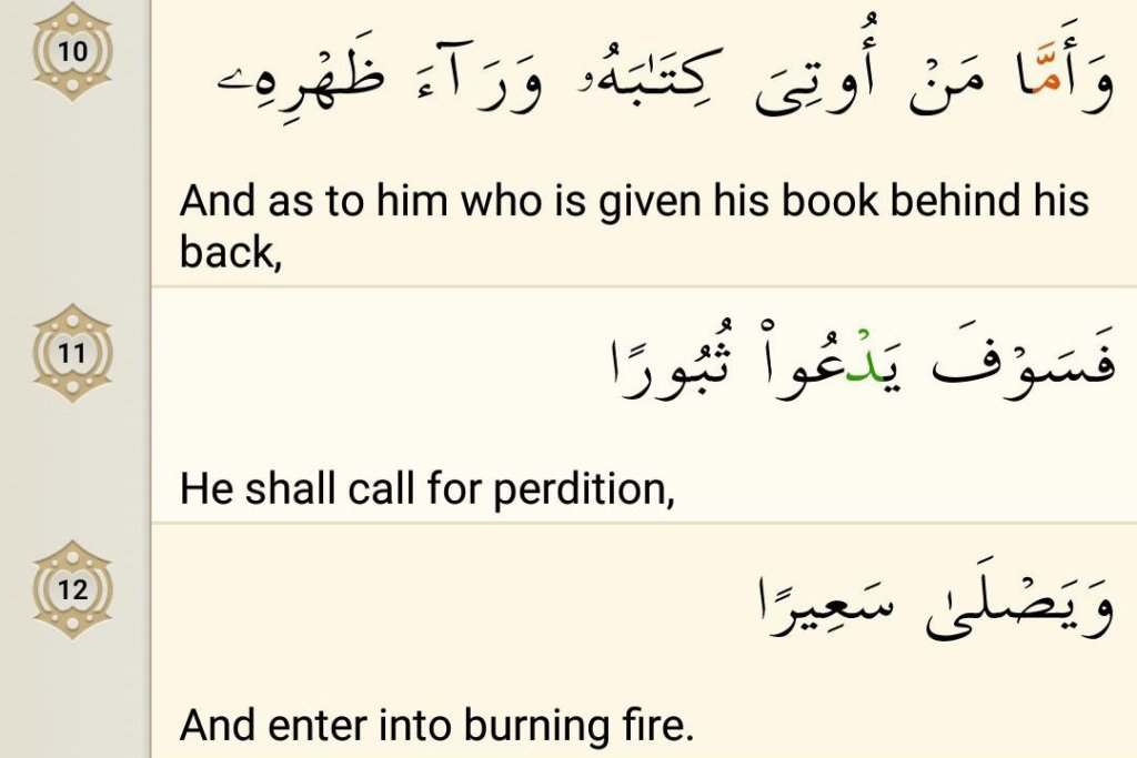 But, when the wicked are given their Record in their left hand, they will keep it behind their back shamefully in order for it not to be seen by others, but unfortunately it is of no use, because nothing is hidden there. This will probably be for the reason that he would already have lost all hope that he would be given his record in his right hand, for he would be well aware of his misdeeds and sure to receive his record in his left hand. However, in order to avoid the humiliation of receiving it in the left hand, in front of all mankind, he will withdraw his hand behind and so would receive it ‘behind his back.