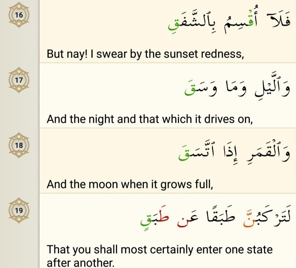 The subject of oaths takes is that O man! You will not remain in one and the same state, but will have to pass through countless stages gradually, from youth to old age, from old age to death, from death to barzakh (the intermediary state between death and Resurrection), from barzakh to Resurrection, from Resurrection to the Plain of Assembly, then to the Reckoning, and then to the meeting out of rewards and punishments. There is a continuous and gradual change taking place everywhere. Therefore, the disbelievers are wrong in thinking that life comes to an end after man has breathed his last.