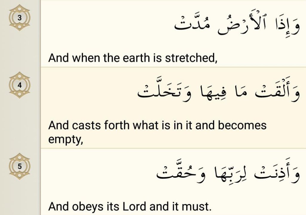 Allah vividly states that how the heavens on the Final Day will split asunder, the earth will be spread out plain and smooth, and it will throw out whatever lies inside it of the dead bodies of men and evidences of their deeds so as to become completely empty from within. On that Day nothing will dare to disobey His Command. For them the only right and proper course is that they should obey the Command of their Lord.