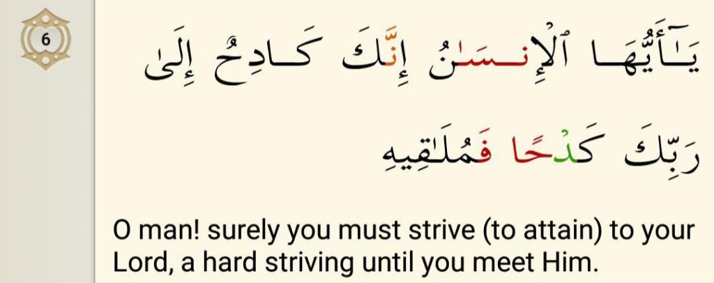 Man is actively engaged in toiling labour. Part of this life is to struggle for things and certain milestones and for every milestone we work hard. Kadh has been described as a struggle towards something, without any distinction as to whether it’s good or bad – you’re just engaged in striving for it and immersed in it to the extent that it exhausts you. Allah says that with all these milestones you can sometimes forget where you’re heading. You’re actually on a motorway and these milestones are just small steps. Where will you end up? You will end up with your lord. Whatever you are engaged in, whether it’s good or bad, you are headed to your lord.