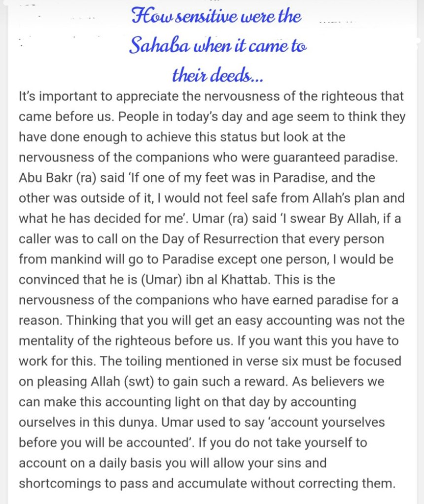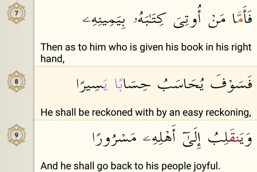 “Here, read my record! Indeed, I was certain that I would be meeting my account.” So he will be in a pleasant life – In an elevated garden.”