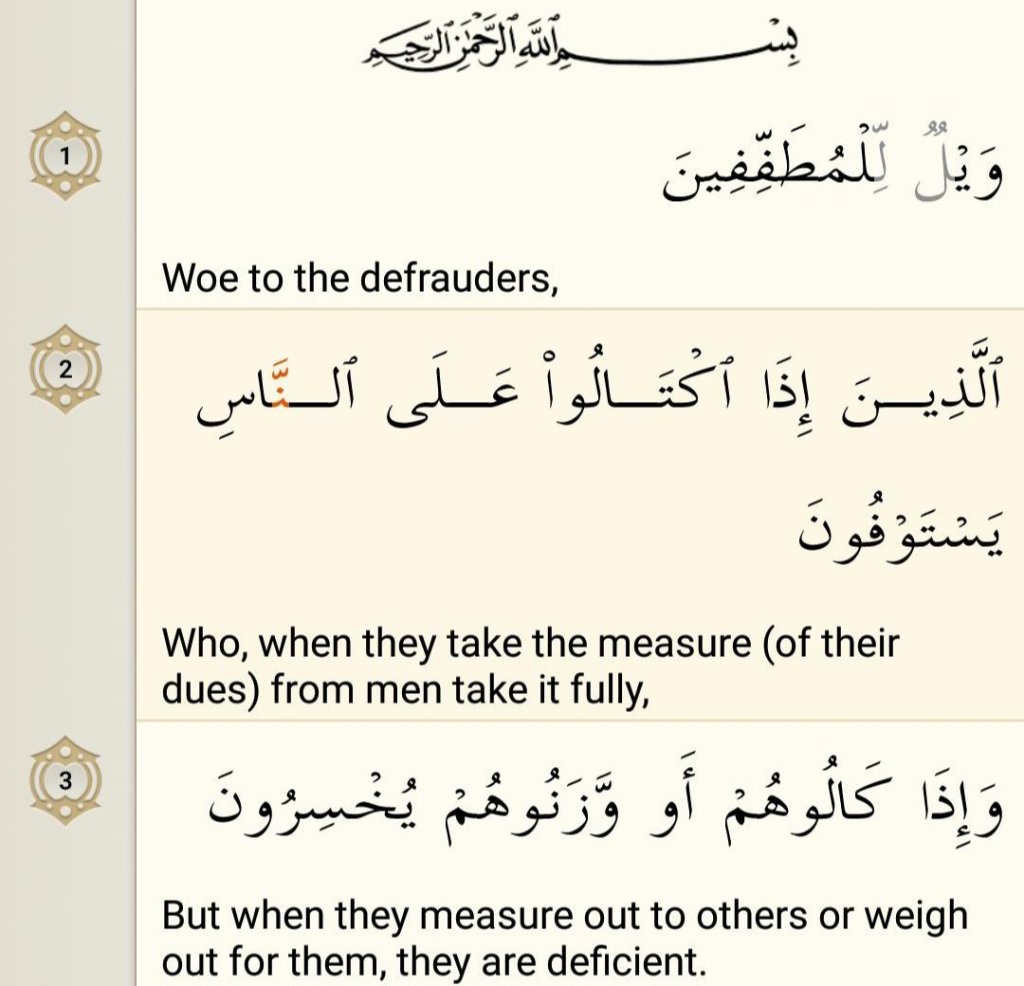This point is also notable that though the verses speak about shortchangers, undoubtedly ‘fraud’ must be taken, here in a more general sense: It consists of giving short measure and short weight, but it covers much more than that. It includes any shortchanging in numericals, (the countable items which are sold one by one). Or, it may include lazy workers or employees who do their duty insufficiently: so the verses condemn even them.