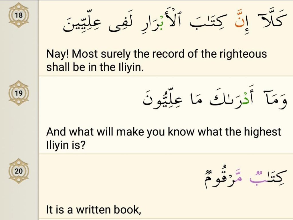 The word illiyeen comes from uluw which means height. The implication is that this book will be in the company of the highest, the angels, and we know that the higher the angels are, the greater in nobility they are and the more responsibility they have. The high group of angels referred to here are responsible for guarding the book of the righteous. Additionally, it is commented that this place is an honoured place found in the highest part of Jannah as well as referring to the high positioned angels. The soul of the believer according to a number of mufassiroon is taken up through multiple heavens until it reaches underneath the throne (arsh) of Allah and there underneath the arsh is the Illiyeen where the record is kept. And it is also commented that the records as well as the souls of the believers both are kept in Illyeen till the Day of Resurrection, and again this is the time of Barzakh!