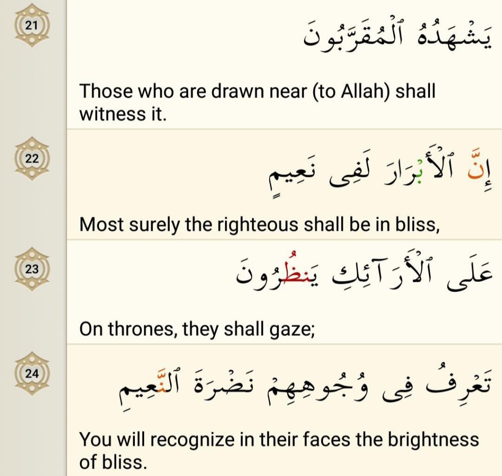 The word naddrah is used to describe the lighting up of one’s face to the extent that you can see the freshness and joy on it. It is also used in Arabic for vegetables that are ripe and fresh but in the Quran it is used for faces. So the faces of these people that are sitting on couches in Paradise are lit with joy and happiness at being there and it’s the blissful things they see wherever they look that lights their faces up.