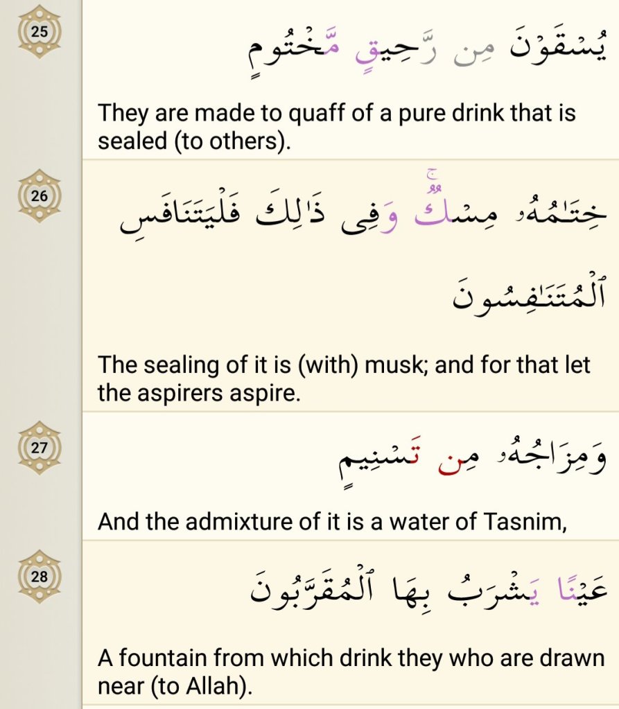 Allah has set the scene with the successful ones reclining and relaxing on their seats and being given drinks. Raheeq is the purest possible wine or drink, which is not contaminated by age or impurities, is crystal clear with great texture and colour, a beautiful smell and it never makes you drunk (no matter how much you drink). The word makhtoom means sealed and tight and thus this drink has been filled to the brim and then sealed waiting for the righteous to open and drink from them.