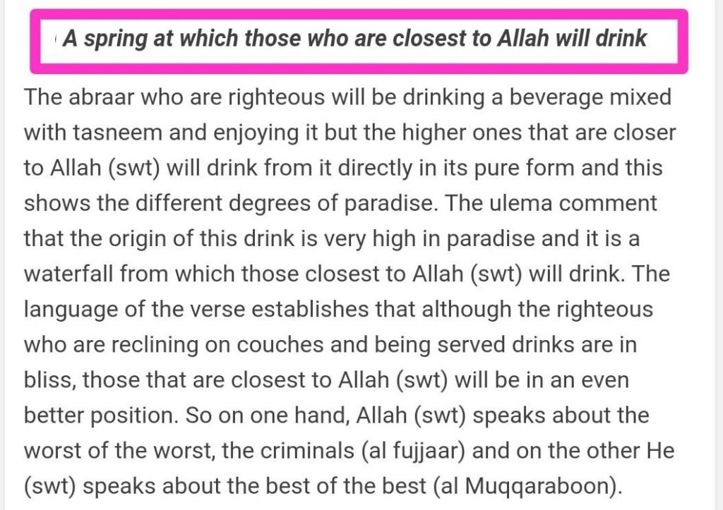 Allah takes our imagination to an even higher level. When the Arabs would mix something in their drink to give a different taste (for example, adding cocoa or sugar to milk) it was called meezaaj. So this wine Raheeq will have a tinge flavour of Tasnim. Tasnim will be a fountain flowing down from a height in Jannah. The flavour added to this drink has been added from a very high fountain or waterfall of Tasnim. So, the drink itself is not tasnim but it has a little flavour from it. When you taste the tasnim in your drink and enjoy and marvel at it you wonder what it is and where it came from, as you’d like it in its pure form.