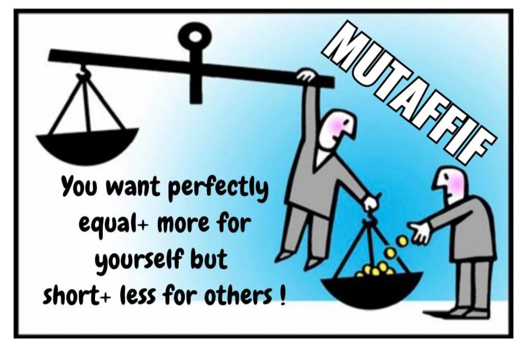 The Surah begins with a profound declaration against a certain type of criminal. The word mutaffifeen comes from tafafa and a doer of tafafa is a mutaffif, a person who when in business will try to get a little more than they deserve when purchasing something and give a little less than they should when selling something. This is done in both tangible and intangible things. For example, in services you might owe someone five hours at work, but you want to get away early and give two minutes less as you think no one will notice – two minutes is not a big deal. Or you have to give someone one kilogram of rice but you put a few grams less on the scales. This is the mutaffif who gets away with so little that the person that gets swindled can’t even come back and complain that he never got the exact right amount, as it will seem petty. So it’s not about taking huge amounts unjustly, but about taking little amounts unjustly and unfairly.
