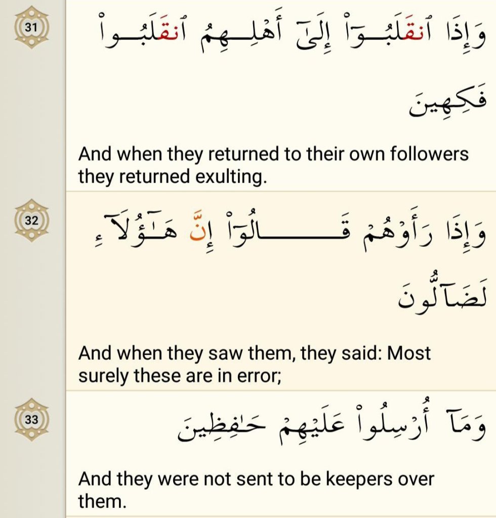 When these disbelievers returned to their people they returned jesting. They talked to each other so proudly and boastingly as if they had won a great victory. Now when they had finished ridiculing the believers they go to their family full of joy and relish in relaying information on the insults they have made. Faakiha means delicious fruit and comes from the verb fakiha which means to be overjoyed, as a person feels good when he eats fruit. Thus, the disbelievers so enjoy ridiculing Muslims it is as if they can taste fruit in their mouth and almost taste joy when they insult them. They share these stories of how they mock the believers with their family. But in Akhirah this evil person will flee from his family, the family that he so enjoyed meeting in dunia.