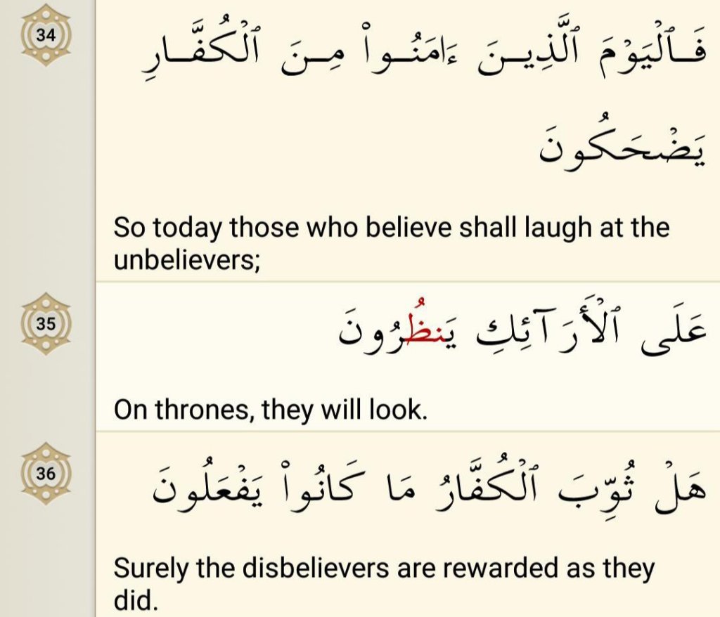 They will be on high couches reclining and looking around with a full view of everything. What will they be looking at? They will be looking at the immense Blessings of Eternity and Allah’s endless Grace, the Dignity and Respect together with the calmness they have in Heaven, and at the painful chastisement that the obstinate arrogant disbelievers are faced with in Hell.