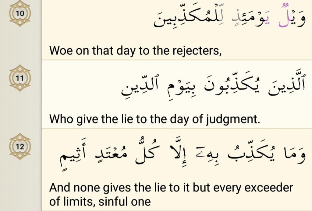 Now Allah says woe that Day (Day of Judgement) to the deniers. It is the denial from which the various sins, including dealing in fraud and transgression, originate. In the first verse Allah said “Woe to the defrauders”, and now it is said “Woe, That Day, to the deniers”, which meaningfully points to the kinds of painful and horrible chastisements awaiting them.