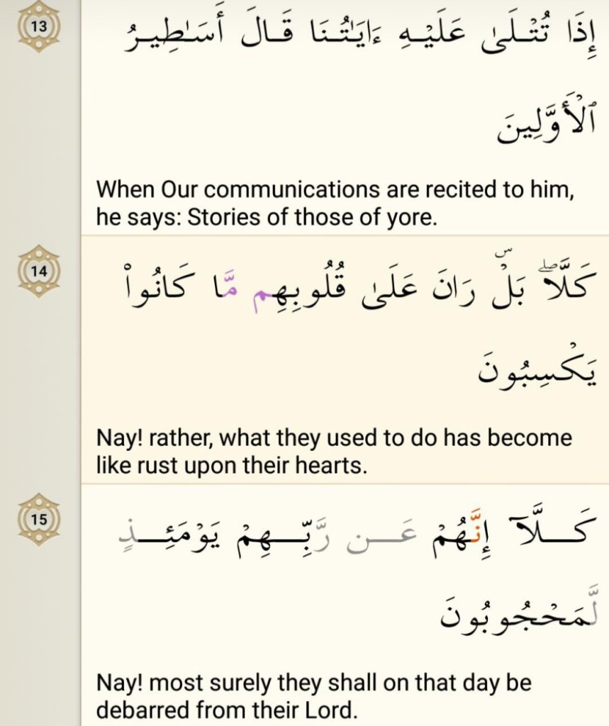 Allah informs us that their heart is covered with raan, a rust imprint that covers their hearts. The heart becomes black through committing sin after sin. And this is the rust through which their senses and understanding of Divine revelations is completely blocked. The explanation of this rust as given by the Prophet pbuh that: