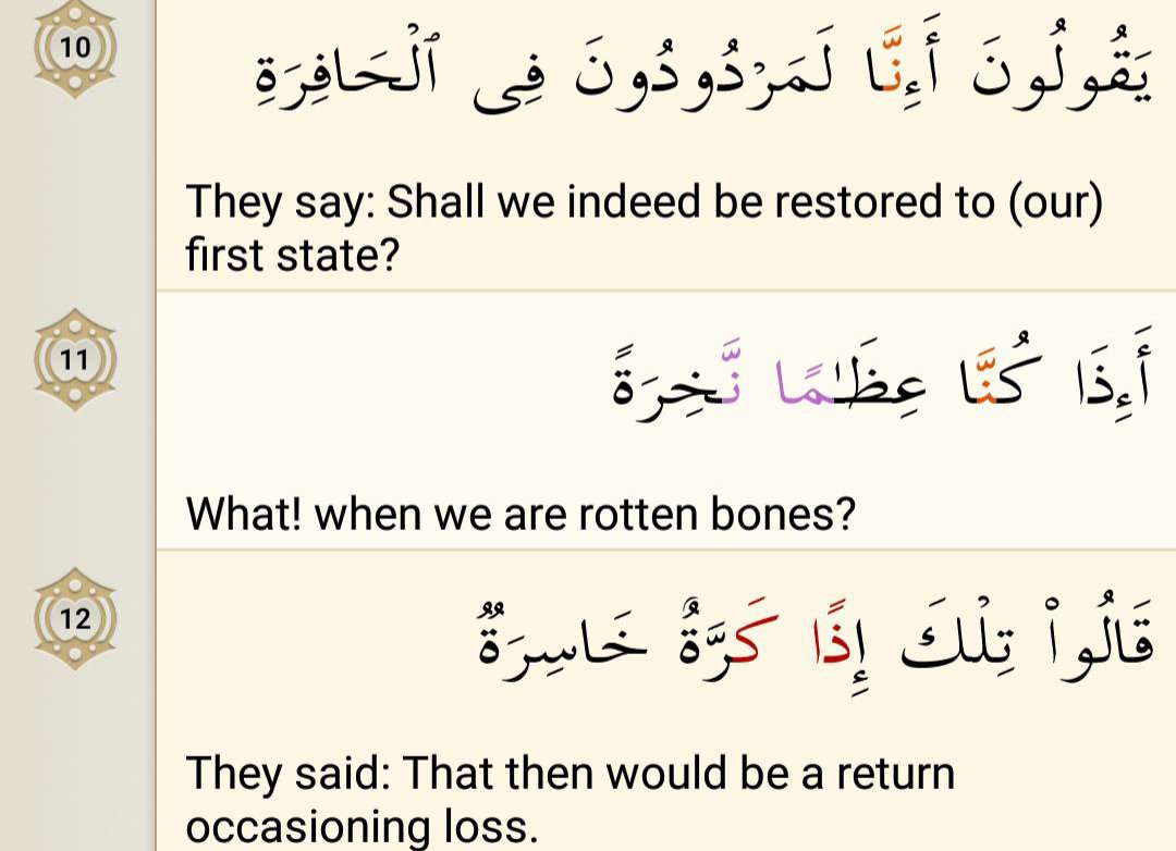 With this verse there is a transition which illustrates sarcasm of the disbelievers. The word radd in mardood refers to a kind of return where you went somewhere and you were not accepted and returned. Here the disbelievers are saying ‘What! Our death was not acceptable and now we have to be brought back to life?’ This is a means of sarcasm from the disbeliever. Al-Hafirah literally means a ditch in the ground that you dig. They are saying ‘Look our ditch is already dug; we’re not going to come out of this now. Resurrection after death does not seem something possible.