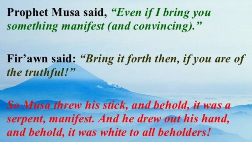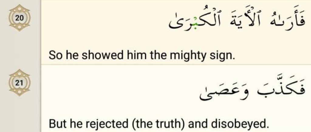 The message here is that in order to help Firoun find that goodness inside him, Allah showed him the ultimate sign (ayat ul-kubra). Kubra is the feminine equivalent of Akbar (as in Allahu Akhbar) and is a superlative adjective in Arabic. We know that Moosa a.s was given many miracles but of all the miracles given to him, Firoun was most afraid of the staff turning into a snake. We know this because Firoun hired magicians to try to replicate only this act and not the other miracles of Moosa a.s. The parallel drawn here between Prophet pbuh and the Quraish is that the Messenger pbuh also gave the people the ultimate sign – the miraculous Quran which the Quraish labelled as magic, poetry, speech of soothsayer.