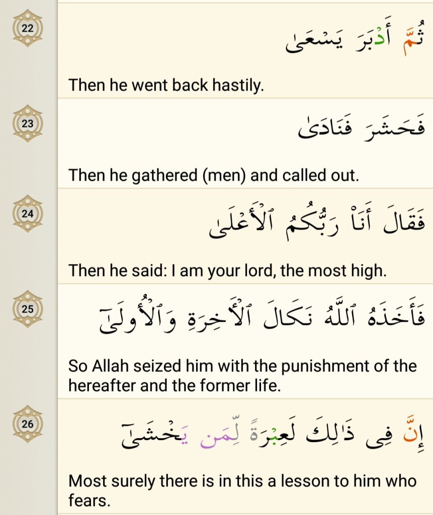After a considerable description in the former verses about Resurrection and the rejection of the disbelievers, in the upcoming verses the painful end of Firoun (Pharaoh), one of the great arrogant blasphemers and rebels of history, is pointed out, to show Pagan Arabs that those who were stronger than them could not stand against Allah’s wrath and punishment, and encourages the believers not to be afraid of the apparent strength of their enemies, because it is easy for Him to destroy them all.