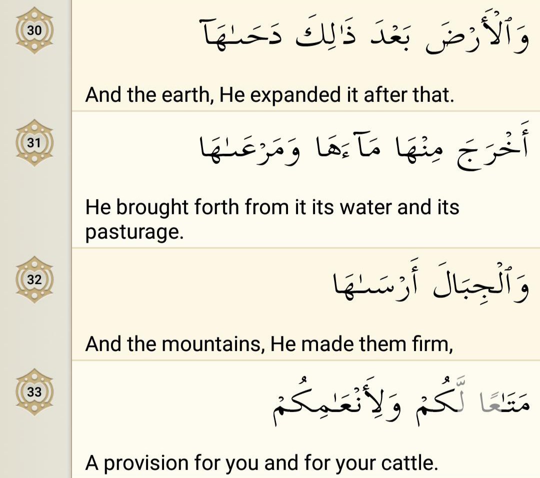 Now Allah mentions the earth that how He expanded it. In the classical Arabic daha means to smoothen and to spread out and Allah is illustrating the powerful creation of the earth and how widely it is spread. Allah firstly says he made the earth flat, smooth and expanded and then he drew from it water and these pasture lands. “Pasture” here does not only imply pasture and fodder for the animals but all kinds of herbal produce suitable for consumption both by man and by animal.