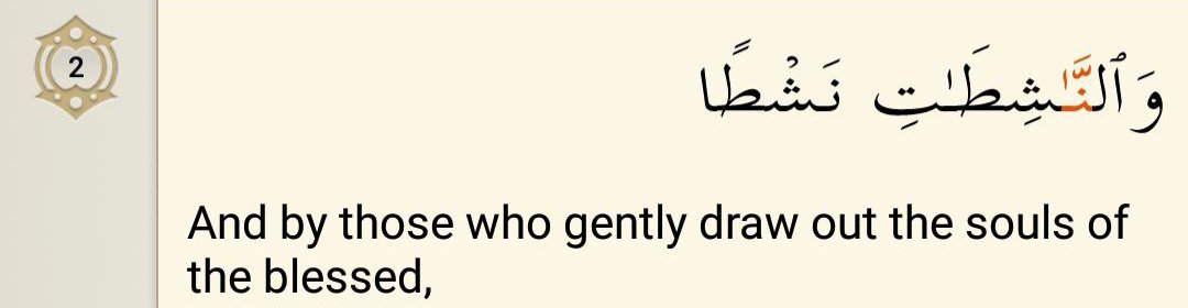 If we take the oath to be talking about angels, then it means By those angels who gently take out the souls of the believers. Where previously the angels pluck the souls of disbelievers so harshly and violently, here in contrast the believers case is the opposite. A believer lives his life in obedience to Allah, knowing one day he has to die and present himself before the Lord, so it’s like when these angles come to take the soul, the soul readily submits in.