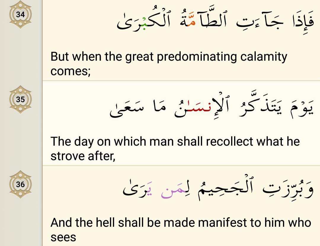 Now Allah talks about the Resurrection and for that the words at-Taammat alkubra have been used. Taammah by itself is a grievous calamity which afflicts everybody. Then it has been further qualified by the word kubra (great), which shows that the mere word taammah is not enough to describe fully its intensity and severity.