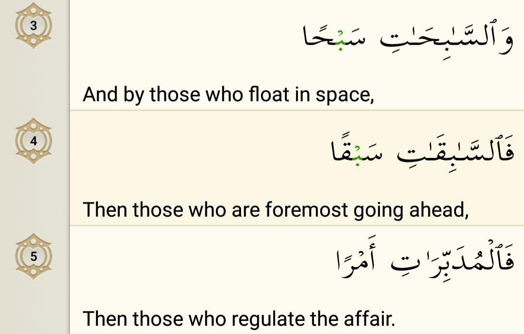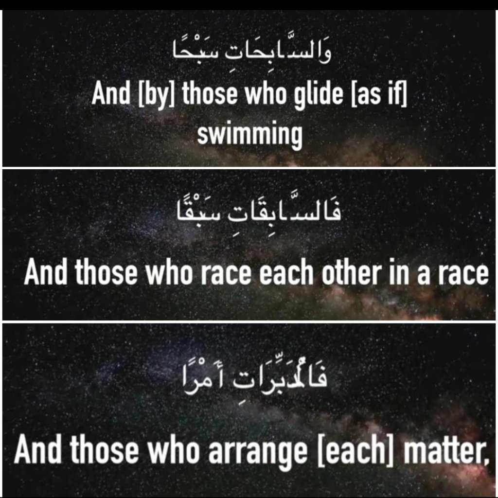 This also means “those who glide about swiftly”, imply the angels, who hurry about swiftly in execution of Divine Commands as though they were gliding through space. These angels hasten out as in a race and hastening out implies that each one of them hurries on his errand as soon as he receives the first indication of Divine Will.