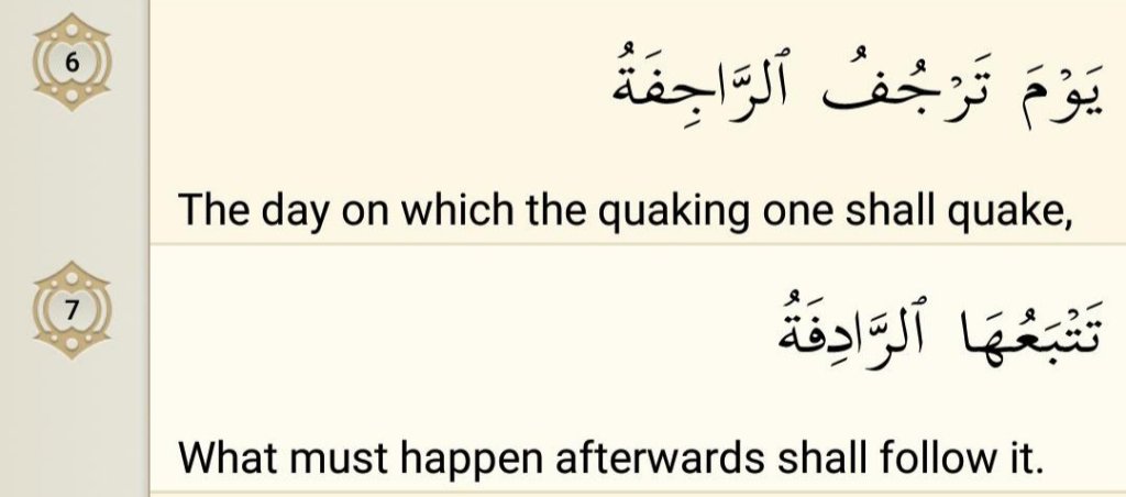 Then this will be followed by Ar-Raadifah which means a person or a thing streaming one after another. . _Radaf literally implies the person (Raadif) who sits behind you when you are riding a camel, horse or car for example. Wherever you go they will follow as they are on the same ride. Allah mentions that there will be another violent vibration and movement one successfully following another i.e. one meant to follow the other. The majority of scholars are in agreement that this verse refers to the second blowing of the trumpet and the previous verse refers to the first blowing of the trumpet. The first jolt implies the jolt which will destroy the earth and everything on it, and the second jolt at which all dead men will rise up from death and from their graves.
