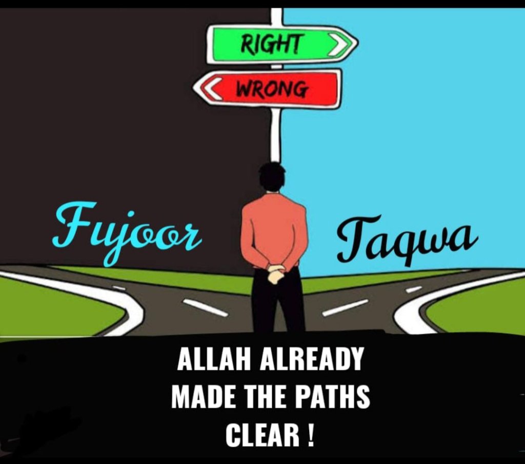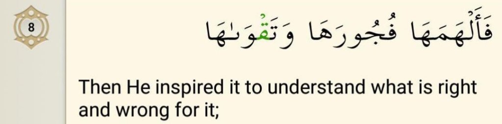 (2) That Allah has endowed every man’s unconscious mind with the concept that there is a moral good and there is a moral evil, that good morals and acts and evil morals and acts are not equal and alike; fujur (immorality) is an evil thing and taqwa (abstention from evils) a good thing.