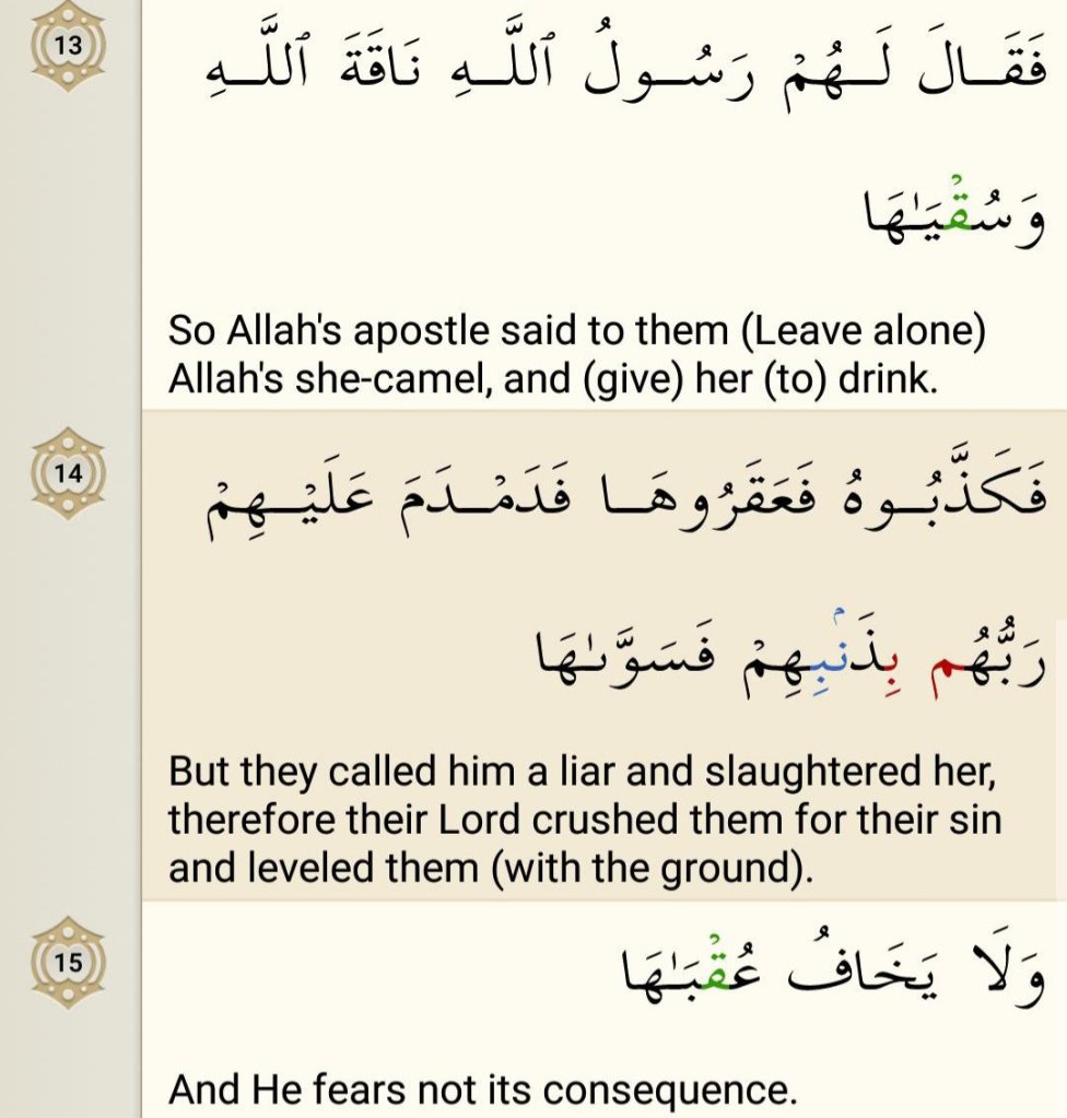 Allah is not like the kings of the world and the rulers of governments, who, when they want to take some action against a people, are compelled to consider what will be the consequences of their action. Allah’s power is supreme. He had no apprehension that some supporting power of the Thamud would come out to avenge itself on Him.