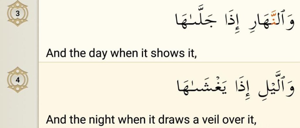 Allah then takes oath in the day as it is displayed. The word jalla is to give brilliance to something, where you give something that is already bright exposure. For example, the lamp that is covered up can only be appreciated when it is exposed. The sun is what causes the day to appear but here Allah is saying that it is in fact the day that gives the sun the opportunity to show and display its full glory. Allah creates opportunities every day for the brilliant sun to be appreciated.