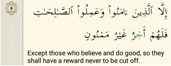 The word mamnoon comes from mann which means cut and ghayru mamnoon means that which will not be cut off. In Arabic al Maneen is used to refer to the cloud of dust in the desert which becomes so thick that you cannot see through it and your view is cut off. The implication is that those who stay firm in belief and do good deeds for Allah’s pleasure will get a reward that does not get cut off. Deeds are temporary but the rewards for performing actions for Allah’s pleasure are endless.