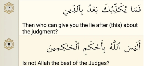 Then Allah says that O Prophet pbuh! Who can after this Clear Truth still reject you being the Messenger and reject the Deen, concerning the rewards and punishments? Another translation of this verse can be: “What can after this (O man ) make you deny the judgment ?” In both cases the intention and purpose remains the same. That is when it is a common observation in human society that a section of mankind which has been created in the best of molds and nature, is rendered lowest of the low because of moral degradation, and the other section remains secure by adopting the path of constant faith and righteousness in view of its being created in the best of molds and nature, how can judgment be denied after this ?