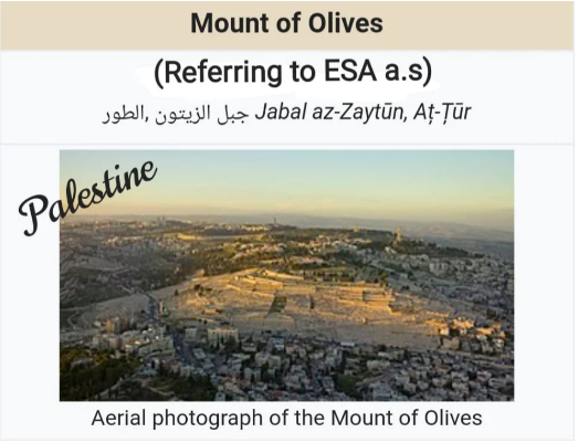 And Zaytoon refers to Mount of Olives, referring to Masjid-al-Aqsa in Palestine, associated with sacred historical importance of Esa a.s. So Tin could be referring to Nuh a.s and Zaytoon to Esa a.s.