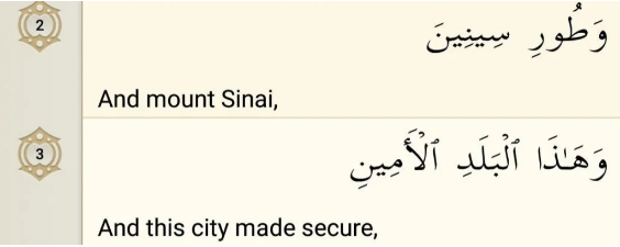 Then Allah takes oath in Mount Sinai. Sinin is another name for the Sinai Peninsula, the mount where Allah spoke to Musa a.s.