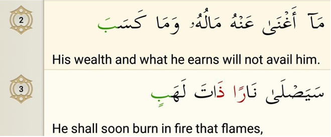 In this verse it is mentioned as a prediction that Abu Lahab’s mission will not succeed. His real name was ‘Abd al-‘Uzza, and he was called Abu Lahab on account of his glowing complexion. He had an attractive fair face. Lahab means the flame of fire, and Abu Lahab the one with a flaming, fiery face. He is mentioned here by his nickname (Kunyat), instead of his real name because he was very well known by this name.