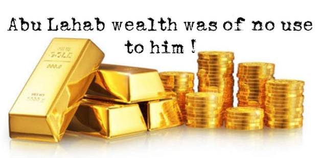 Abu Lahab was a stingy, materialistic man. He was one of the four richest men of the Quraish, who owned one qintar (about 260 oz) of gold. His love of wealth can be judged from the fact that when on the occasion of the battle of Badr the fate of his religion was going to be decided for ever, and all the Quraish chiefs had personally gone to fight, he sent Aas bin Hisham to fight on his behalf, telling him that this is in lieu of the debt of 4000 dirhams that you owe to me. So he remained behind in Makkah and sent Aas on his behalf.