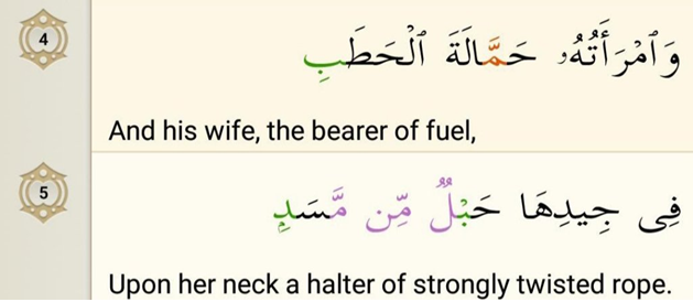 Now Abu Lahab’s wife, Umm Jamil is condemned that she too will have a wretched destiny. She used to strew thorns at the Prophet’s pbuh door in the night; therefore, she has been described as carrier of the wood/fuel for her evil act. Another opinion is that she used to carry evil tales and slander from one person to another in order to create hatred between them; therefore, she has been called the bearer of wood/fuel idiomatically.