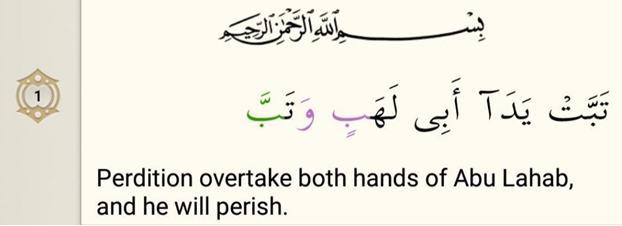When the Prophet pbuh was commanded to present the message of Islam openly, and was instructed to warn his nearest kinsfolk first, he pbuh ascended the Mount Safa one morning and called out aloud to call people to Islam. Thereupon, before anyone else could speak, Abu Lahab said: “May you perish! Did you summon us for this?” He picked up a stone to throw at the Prophet pbuh.