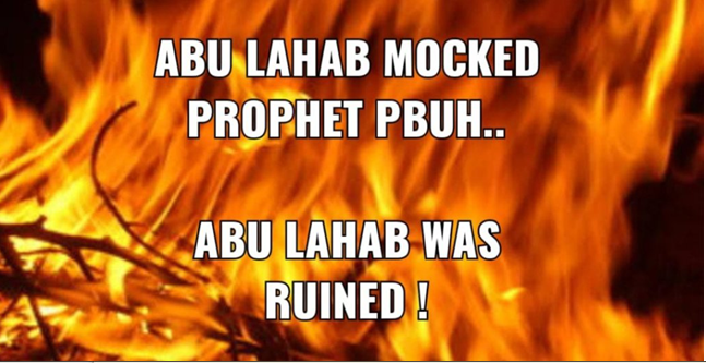 In Makkah Abu Lahab was the next door neighbour of the Prophet pbuh. Their houses were separated by a wall. Abu Lahab family always tortured Prophet pbuh. Sometimes when he pbuh was performing the Prayer, they would place the goat’s stomach on him; sometimes when food was being cooked in the courtyard, they would throw filth at the cooking pot.