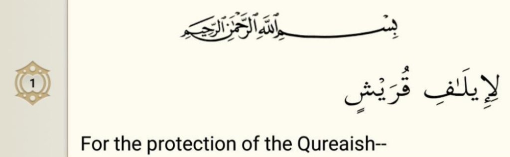 This Surah talks about the tribe of Quraish who were blessed in many ways and was revealed to call them to proper course of Faith.